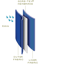 ESTERNO: Serve a proteggere, dalla pioggia, neve e vento impedendo cosi bruschi abbassamenti della temperatura corporea. I tessuti, oltre che perfettamente impermeabili, devono essere anche traspiranti per evitare la condensa, resistenti a strappi e abrasioni nonché sufficientemente leggeri per non causare ingombro od ostacolo al movimento. I capi che fungono da ultimo strato devono sommare l'azione di protezione dagli agenti atmosferici e quella traspirante, quest'ultima fondamentale per non vanificare il lavoro "di pompa del sudore" svolto dall'abbigliamento interno. Anche questi tessuti hanno diverse pesantezze per meglio adattarsi alle varie situazioni sportive e di outdoor: il giubbino del ciclista avrà caratteristiche diverse rispetto alla giacca dello sci-alpinista, del motociclista o dello scalatore himalayano. Tutti i tessuti Shellyter®, GoreTex®, Sympatex®, ecc. basano le loro caratteristiche di impermeabilità/traspirabilità su una membrana che ha delle microporosità con fori di diametro inferiore a quelli delle gocce d'acqua, ma che fanno liberamente rilasciare il vapore d'acqua derivato dalla sudorazione fornendo nel contempo una valida barriera antivento.